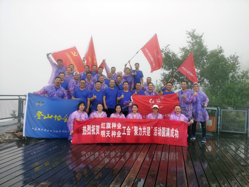 為進一步增進與兄弟單位的深厚友誼,會后,雙方工會開展“聚力共建、攀登紫金”的主題登山活動。途中偶遇瓢潑大雨,大家面對困境,不畏艱辛,互幫互助,堅持登頂,共同合影留念?!凹t旗明天更美好、明天紅旗更鮮艷”成為響亮的共建口號。汗水與雨水的融合,完美的詮釋了紅旗種業(yè)、明天種業(yè)的企業(yè)文化,體現(xiàn)出種業(yè)人艱苦奮斗、勇攀高峰的精神面貌。