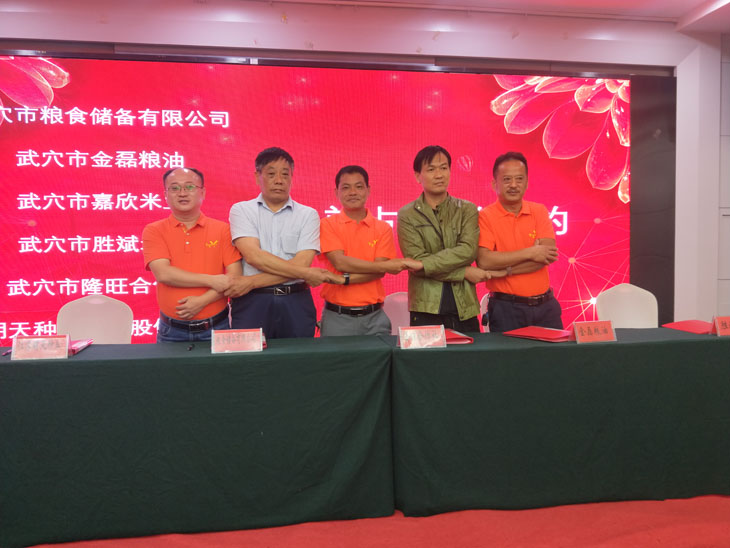 會議最后舉行了“富美占”戰(zhàn)略簽約儀式,武穴市糧食儲備有限公司、武穴市隆旺合作社、江蘇明天種業(yè)科技股份有限公司以及多家米企負(fù)責(zé)人上臺共同簽署了“富美占”戰(zhàn)略合作協(xié)議。