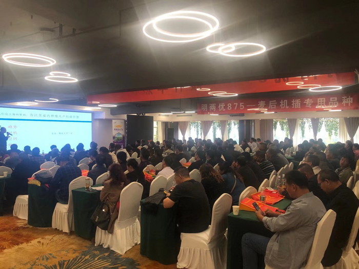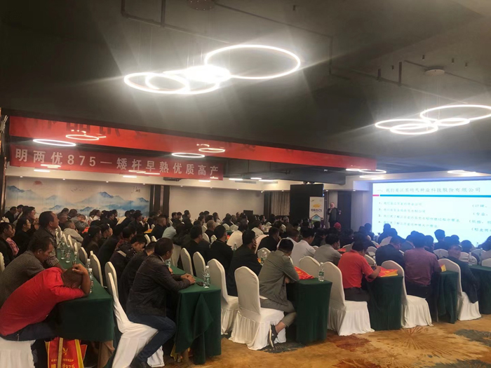 “明兩優(yōu)875”麥后機(jī)插新品發(fā)布會在沭陽業(yè)事國際酒店會議廳召開。會議由江蘇明天種業(yè)雜交水稻部高俊賢先生主持,高經(jīng)理首先對各遠(yuǎn)道而來的客人表示熱烈歡迎,并希望明兩優(yōu)875的推廣能夠?yàn)榻K雜交水稻麥后機(jī)插發(fā)展做出新貢獻(xiàn)。