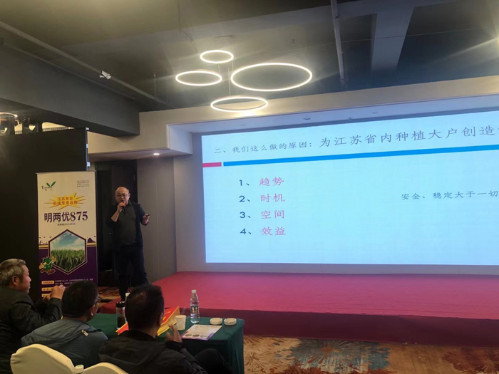 會議首先由盧偉林經(jīng)理向參會代理商、種植大戶、育秧合作社代表介紹明兩優(yōu)875的特征特性以及今年各縣市示范田間表現(xiàn)情況。盧經(jīng)理介紹到隨著土地流轉(zhuǎn),種植大戶越來越多,雜交水稻移栽成本居高不下、人工緊缺,大戶用工難、收益低。明兩優(yōu)875的生育期、抗倒性、抗病性及產(chǎn)量結(jié)構(gòu)就特別適合當(dāng)下種植大戶和育秧合作社做雜交稻麥后機(jī)插種植。因此雜交水稻的麥后機(jī)插勢不可擋,明兩優(yōu)875應(yīng)勢而出,適時(shí)填補(bǔ)了江蘇淮北雜交水稻麥后機(jī)插合法品種的空白。同時(shí)詳細(xì)介紹了明兩優(yōu)875的栽培管理措施。